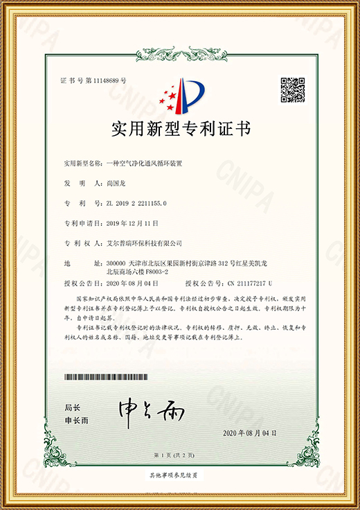 實用新型專利證書(一種空氣凈化通風循環(huán)裝置